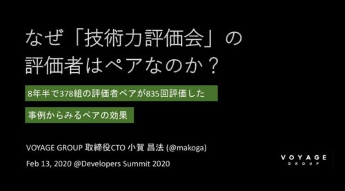 また技術力評価会ネタかよ!と言われそうですが、デブサミ2020で登壇しました、 @makoga です。 デブサミのテーマが「ともにつくる」だったので、一般的な企業では1人で実施していることが多いけど、VOYAGE GROUPでは「ともにつくる」ようなことって何がある…