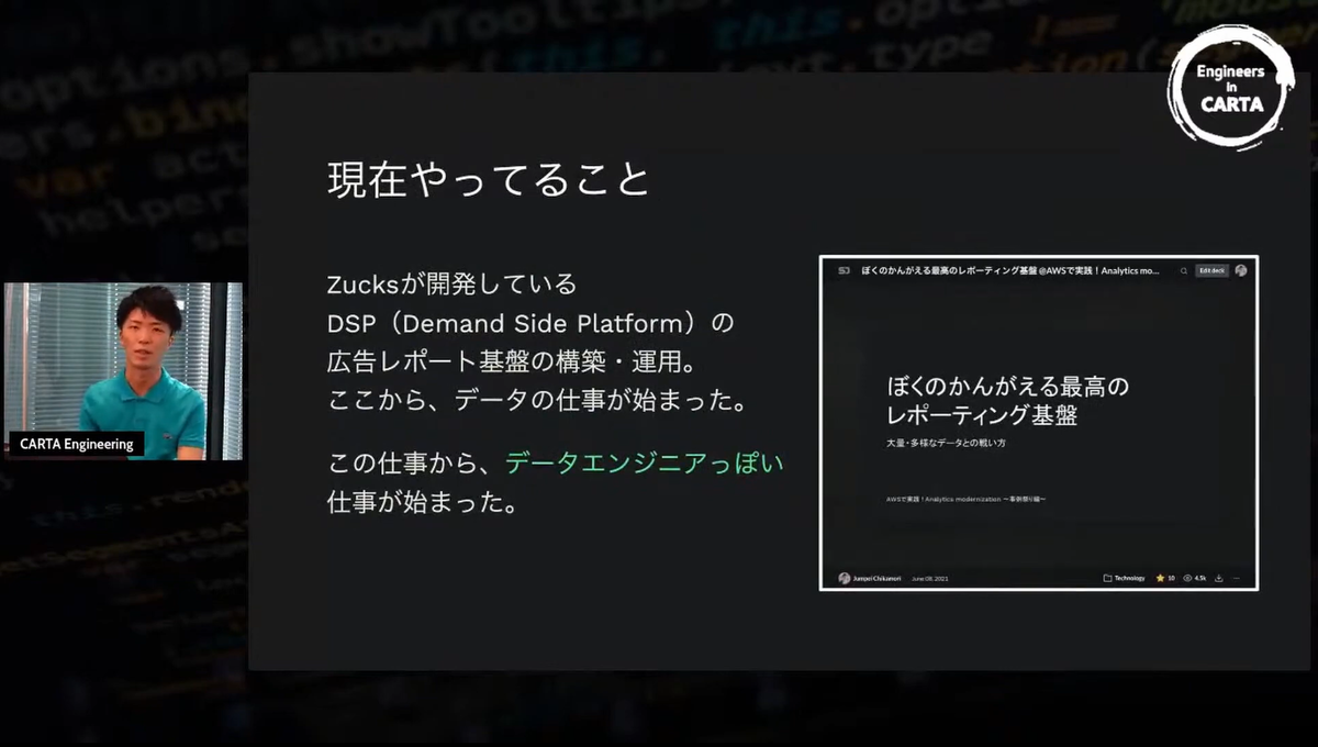 現在は、CARTA HOLDINGS の Zucks で DSP の広告レポート基盤の構築運用をやっています。ここからデータの仕事が始まりました。