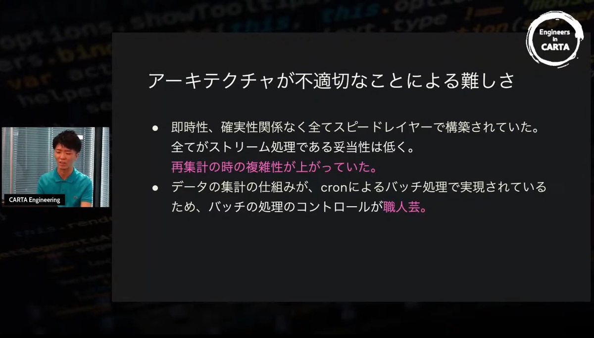 データによって求められている要件が色々ありますが、大きく分けると、即時性が大事なパターンと、確実性が大事というパターンがあります。しかし、関係なく全てスピードレイヤーで構築されていました。全てストリーム処理でやっていたのですが、調べてみると深い理由はなく、なんとなく最初に作ったものの横に生やしたような状態でした。結果、再集計の時の複雑性だけ上がっていて、何が嬉しいのかわからなくなっていました。
