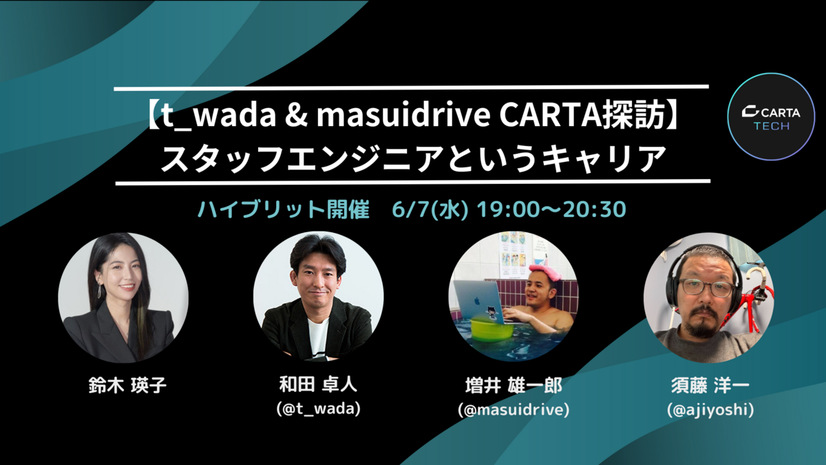 このイベントでは書籍の監修・解説を担当されたmasuidriveさんをお招きしスタッフエンジニアという役職について学びます。 また、モデレータとして、書籍『事業をエンジニアリングする技術者たち―フルサイクル開発者がつくるCARTAの現場』を編集いただいた和田さんを加えて、ITエンジニアでのキャリア論についてこれまでの経験をもとに語っていただきます。