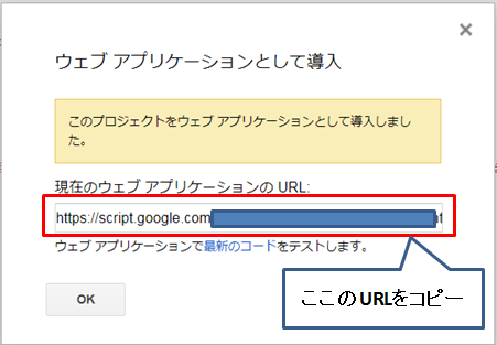 GASをWebアプリケーションとして公開するには、GASのメニューより「公開」→「ウェブアプリケーションとして導入」を選択する。基本はデフォルト設定のままで良いが、アプリケーションにアクセスできるユーザーを全員(匿名ユーザーを含む)にしておく必要がある。その後、更新を押し、 現在のウェブ アプリケーションの URLをコピーしておこう。