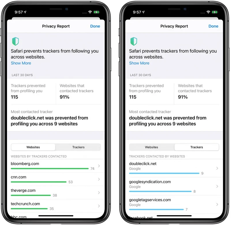 「プライバシーレポート」では、ユーザーに対して、過去30日間にブロックされた全てのクロスサイトトラッカーのサマリーを表示する。これはiOS14とmacOS Safari(モバイルとデスクトップ)の両方で動作すると見られる。クロスドメイントラッキングはSafariのIntelligent Tracking Prevention(ITP)によって既にブロックされているが、今回のアップデートでは、ITPによってどの企業がブロックされているのかがユーザーに対して示されるようになる。(Appleがこのレポートのために既知の企業名をどのように導き出しているのかは不明。)