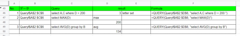 スプレッドシート上の任意の範囲をDBのテーブルとみなし、そこに対しSQLのような記述でデータの検索ができる関数です。