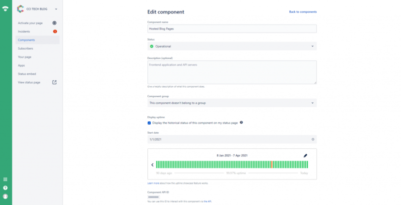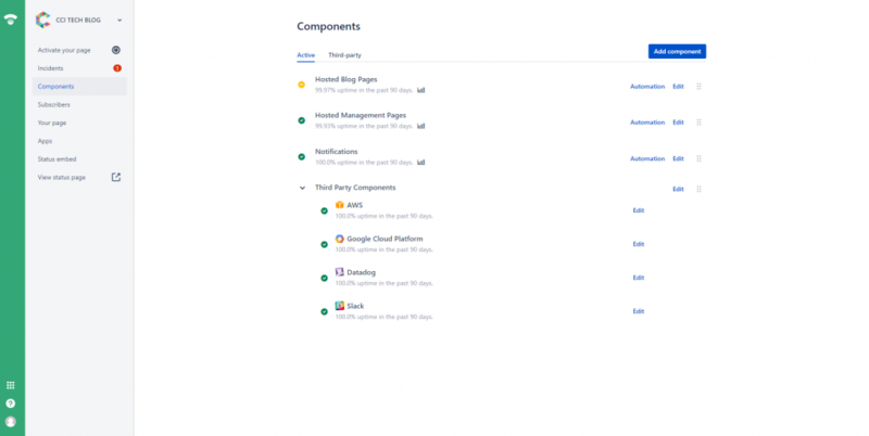 連携プロダクト稼働率は、Components(Third-party)を利用し実現可能 - 3rd Party連携プロダクトにインシデントが発生しサービス稼働状況に変更があった際にチームSlackに通知したい。またその際の稼働率も計測したい。