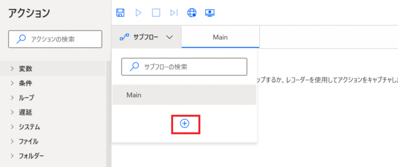 サブフローだけだと実行が出来ないので、メインフローにサブフロー呼び出しを作成して実行できるようにする。