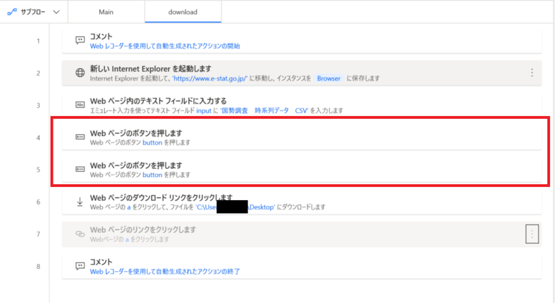 終了すると、downloadサブフロー内に操作した内容が表示される。