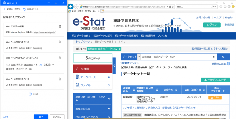 今回はe-statで人口統計のcsvファイルをダウンロードするのでe-statへ遷移すると、下記画面のようにWebレコーダーの遷移先がe-statになる。