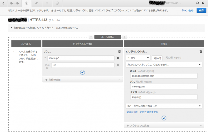設定項目 設定値 THEN リダイレクト先 プロトコル HTTPS ポート #{port} カスタムホスト、パス、クエリを使用 ホスト BBBBB.example.com パス /#{path} クエリ #{query} ステータスコード 301 - 完全に移動されました