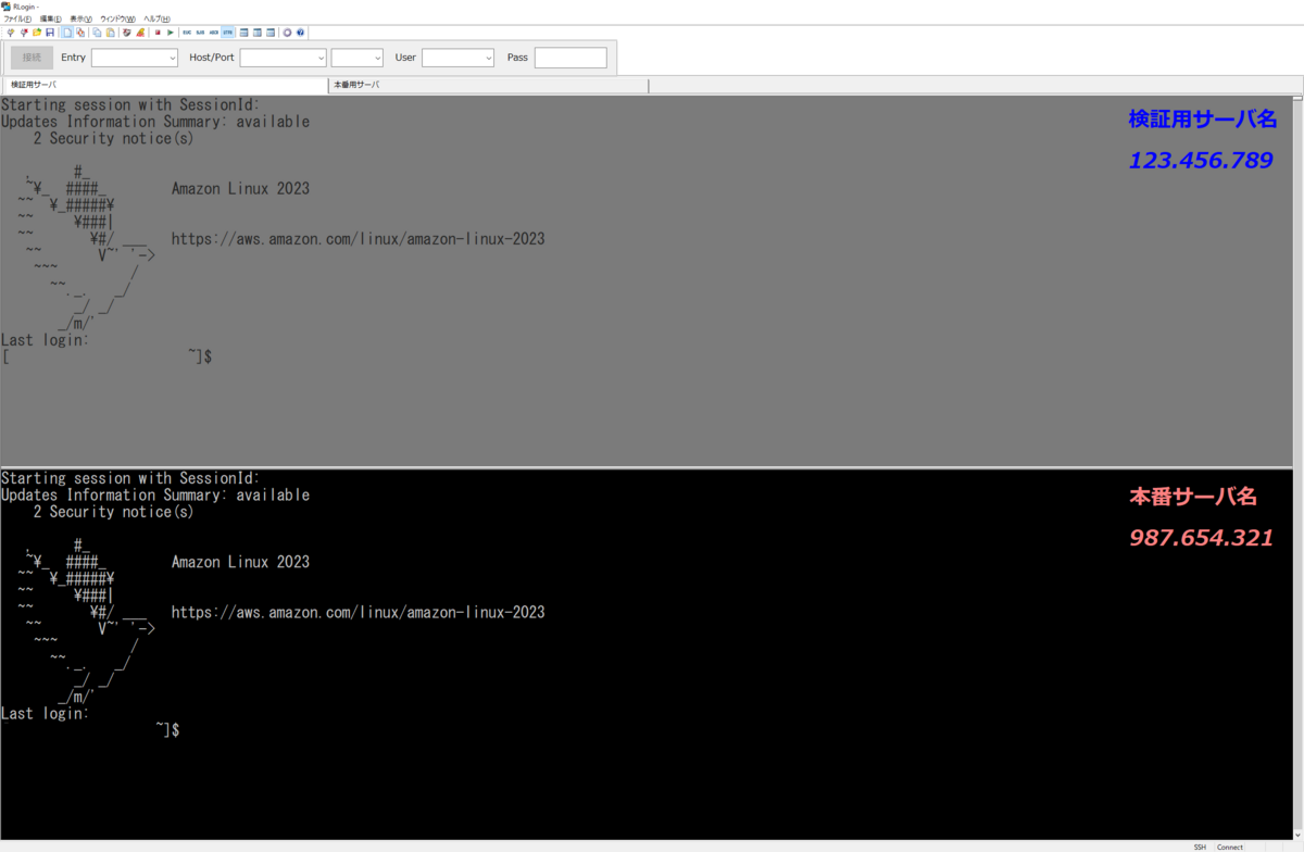 下領域が踏み台サーバのターミナルコンソールなのですが、自動で踏み台サーバにログイン&本番サーバへSSH接続ログインしているポートフォワード扱いになっているため、タブ選択を間違えて本番サーバでコマンド実行しているつもりで間違えて踏み台サーバでコマンドを実行していた!と言う事もありません。