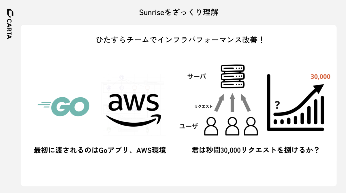 Sunriseは、5日間のインフラパフォーマンス改善インターンシップです。目標は、渡されたアプリケーションを改善し秒間30,000リクエストを処理できるようにすることです。