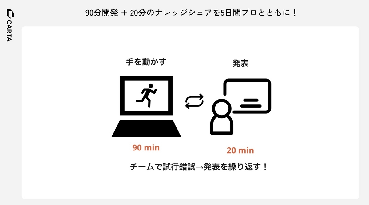 5日間のプログラム中、チームは90分の開発と20分のナレッジシェアを繰り返し行います。