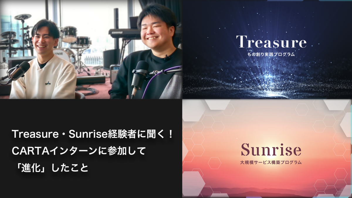 この記事ではCARTAのエンジニアサマーインターンTreasure・Sunriseをわかりやすくご紹介します!また、後半ではTreasure・Sunriseに参加し、「進化」したことを経験者に聞いてみました。